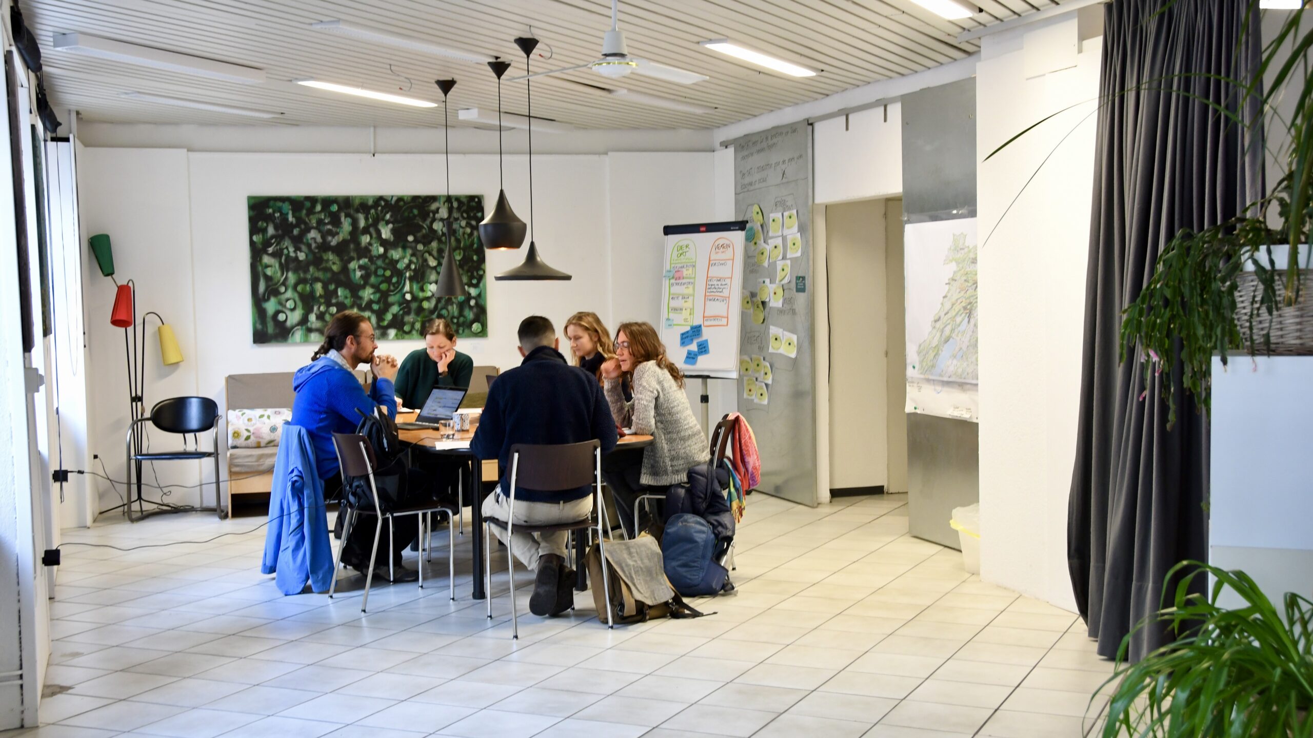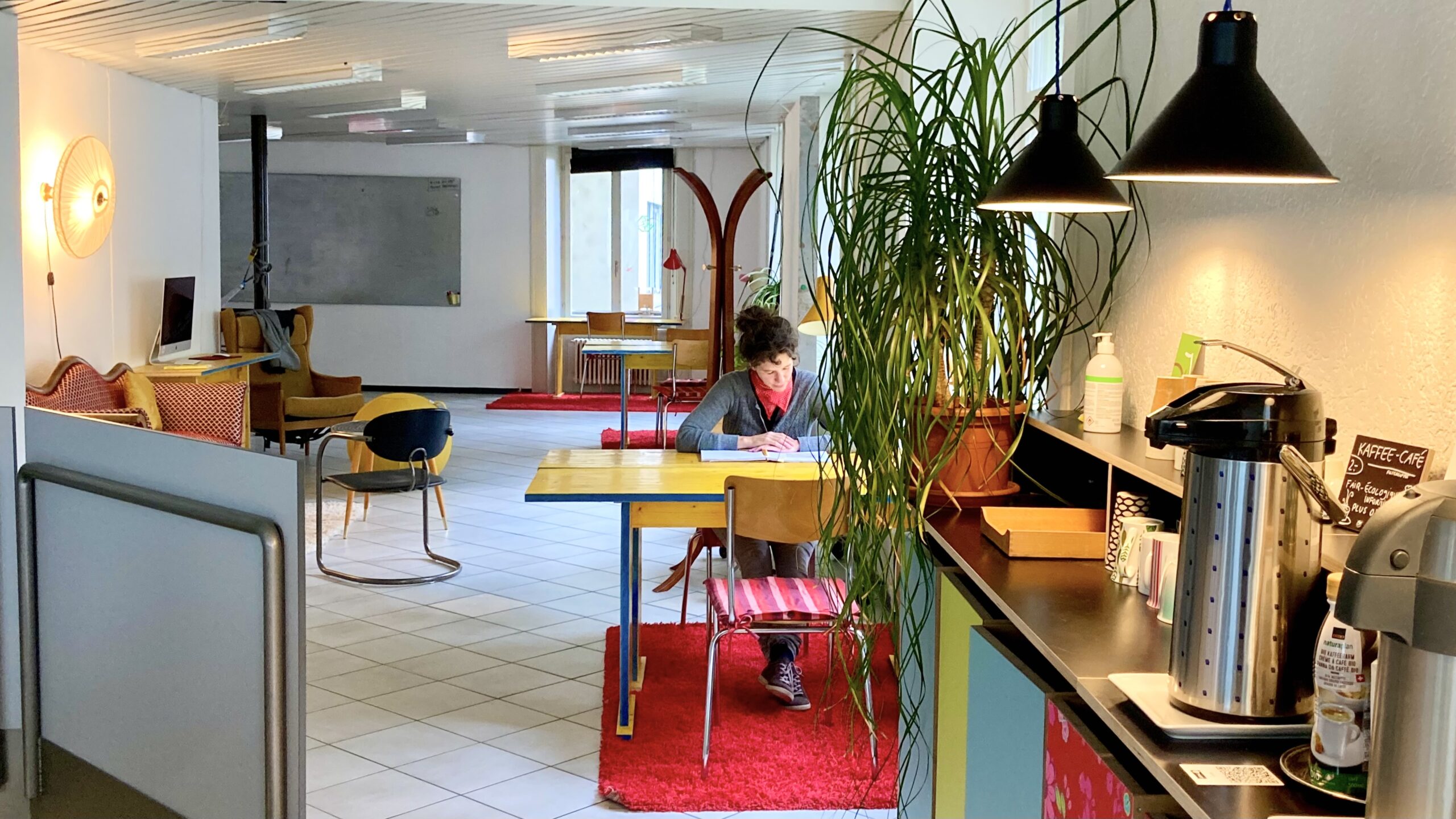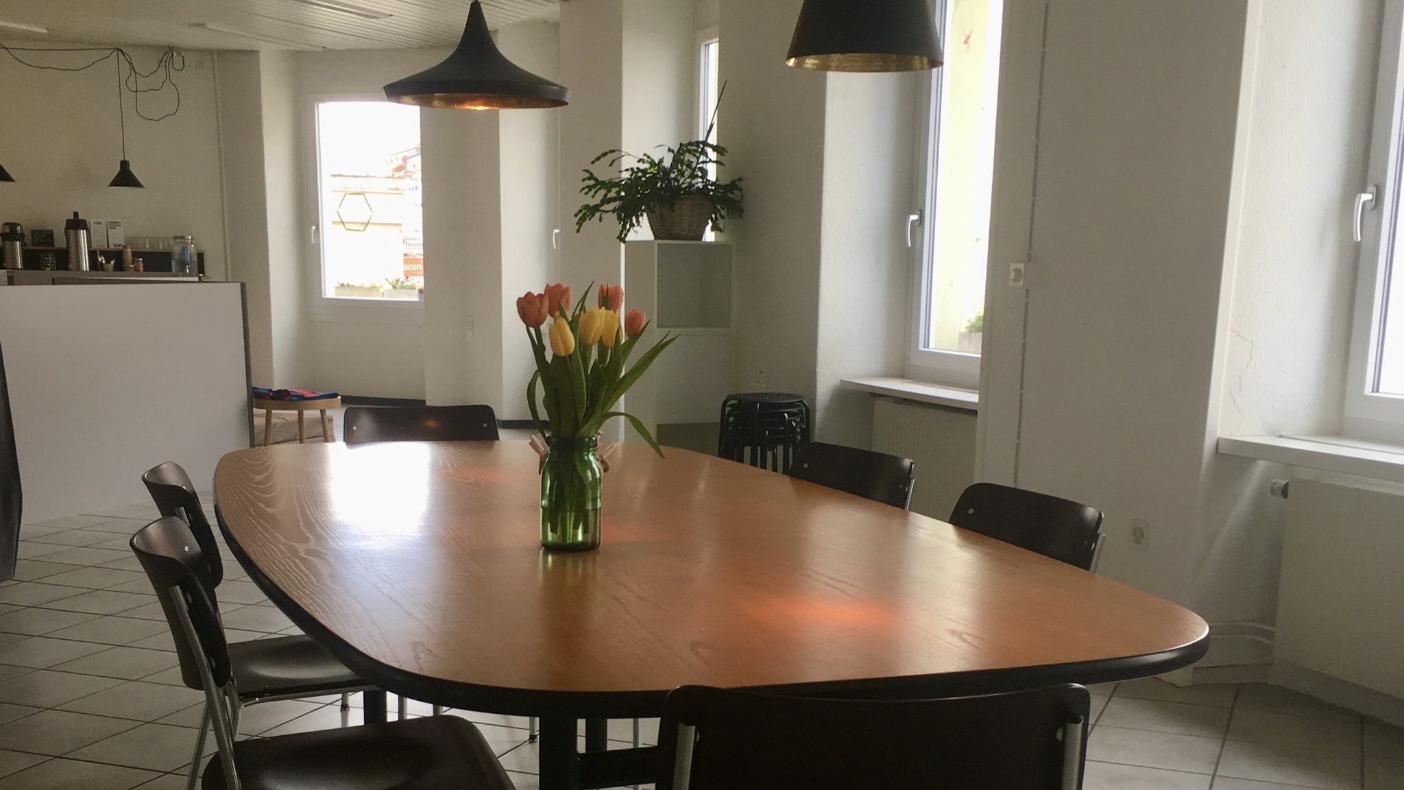 Der Sitzungstisch im 1. Stock ist für 8 Personen konzipiert. Er kann durch Zustelltische verlängert werden, so dass 12 Personen oder auch mehr, bequem Platz finden. Der Tisch eignet sich auch für Ateliers und Workshops. Die Küche mit Wasseranschluss ist gleich nebenan. Die Abtrennung vom restlichen Raum ist mit einem Vorhang und einer Schiebewand möglich. Was dir hier auch noch zur Verfügung steht: