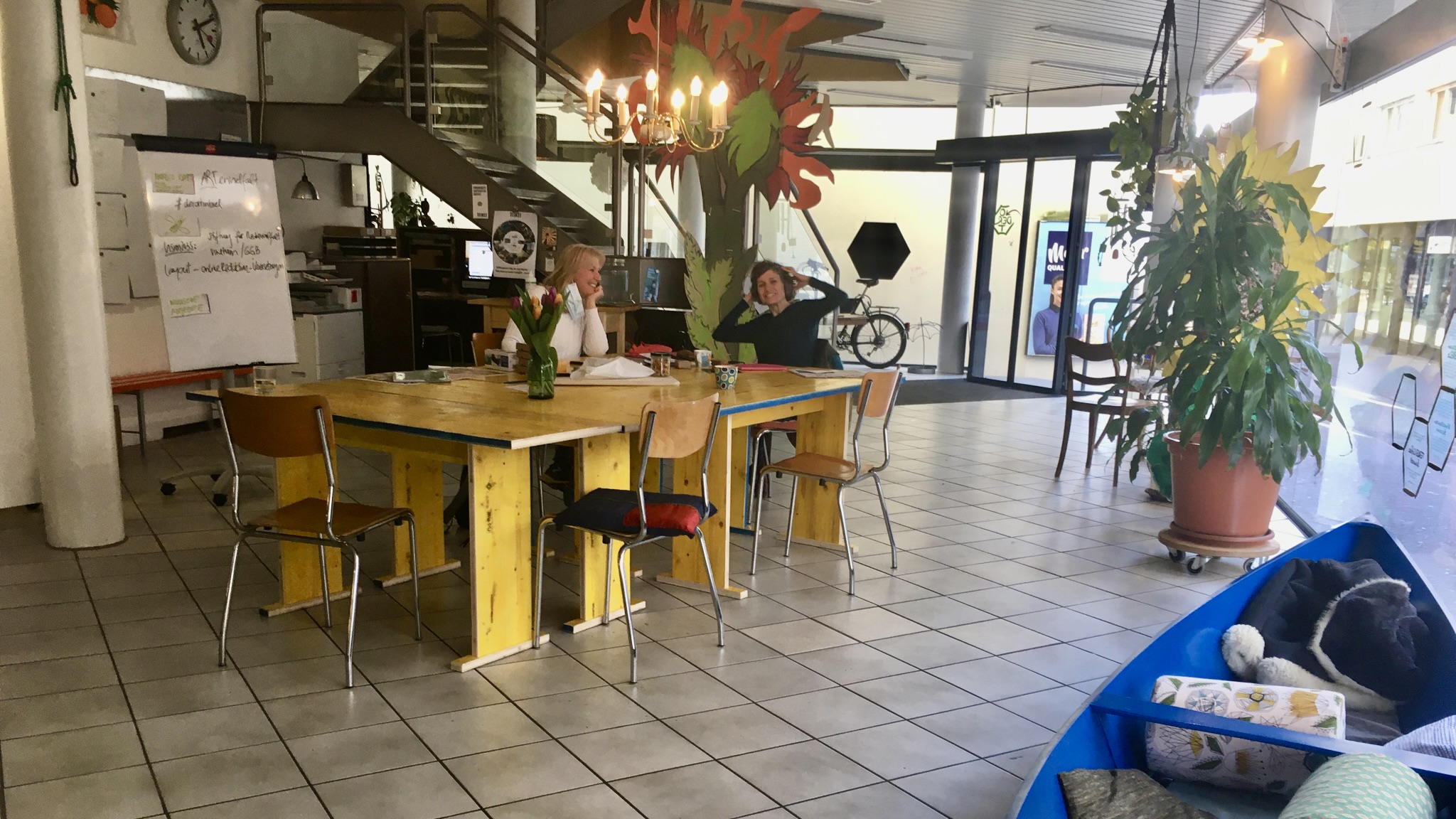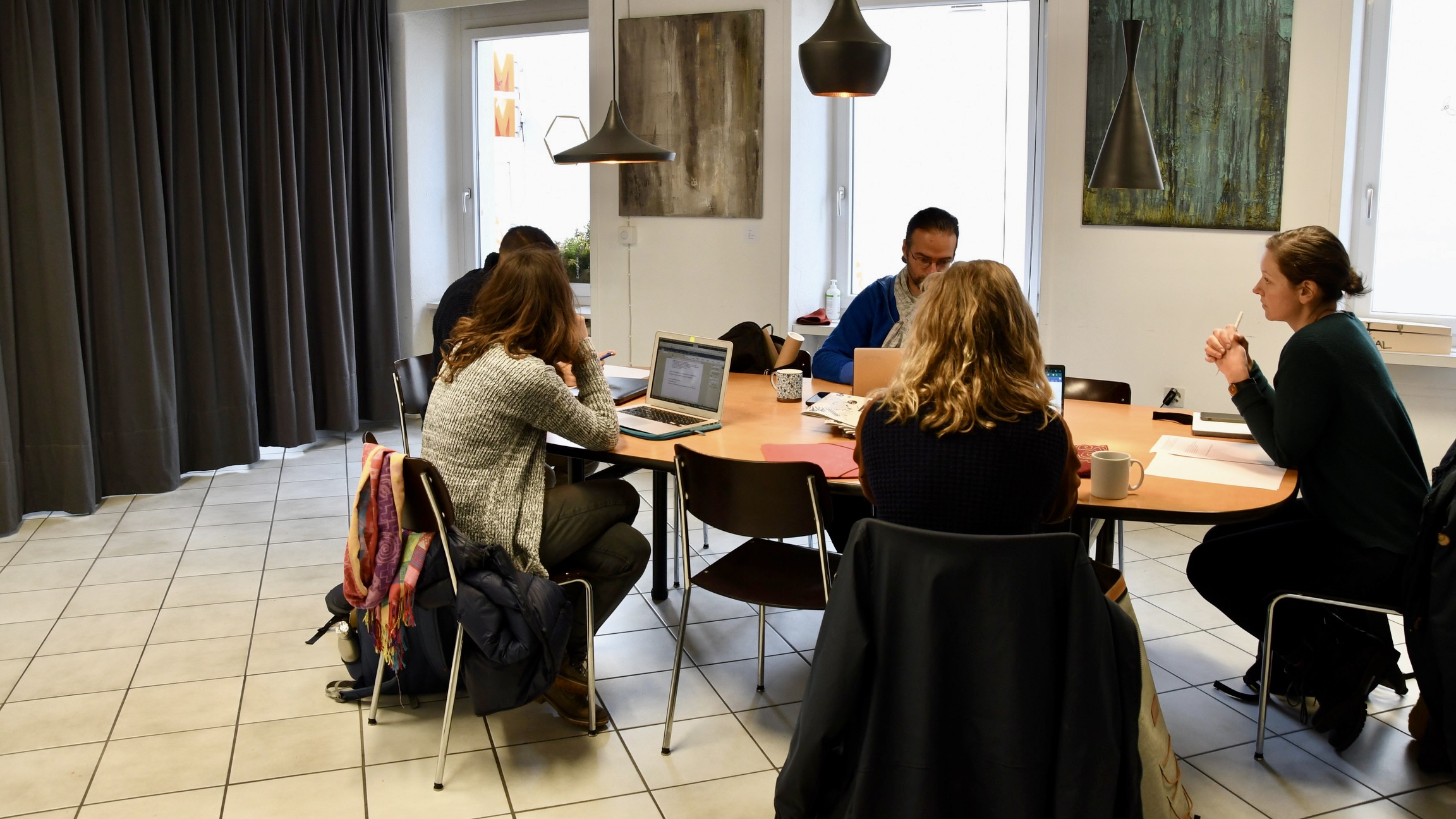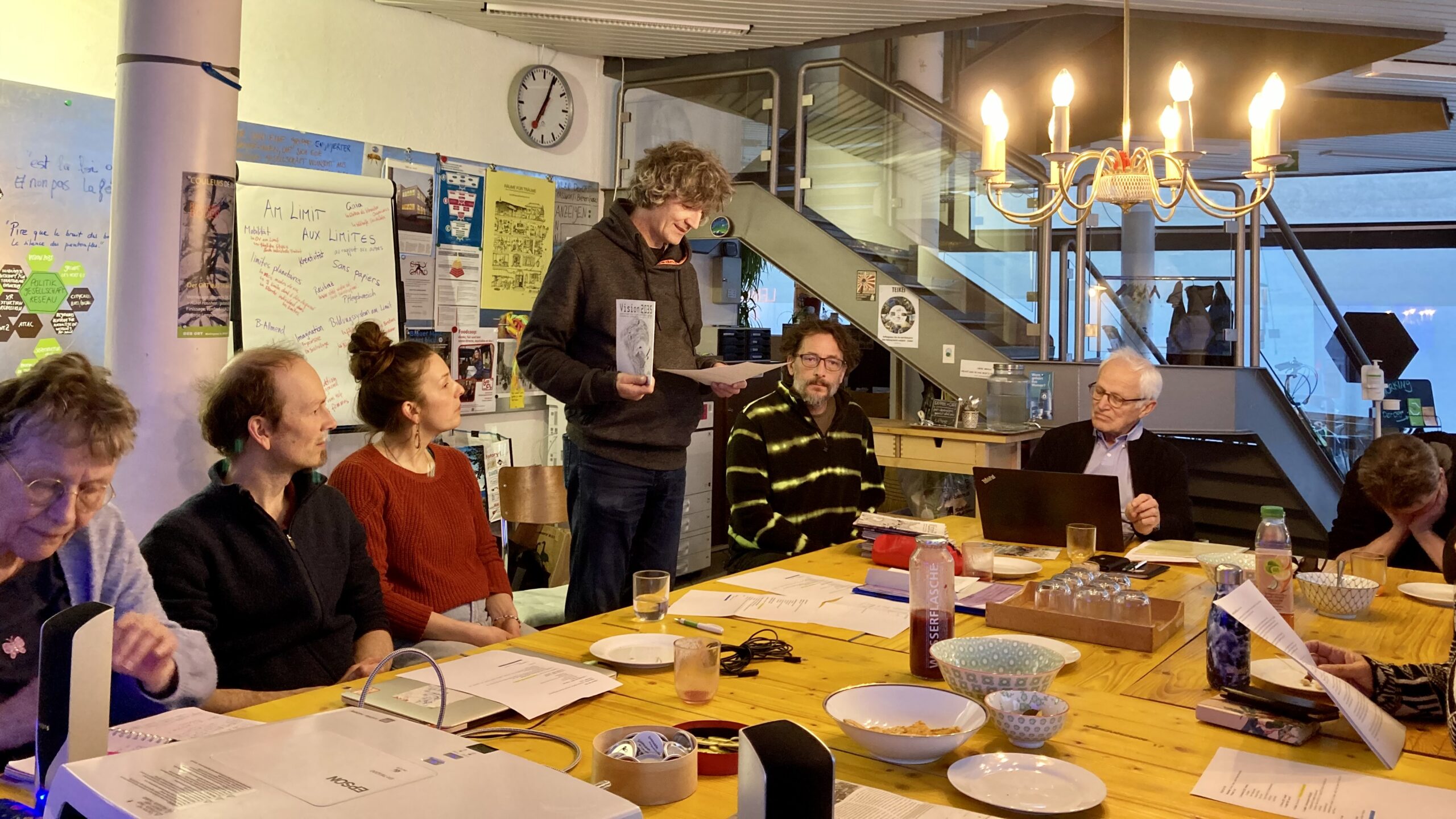 Der Sitzungstisch im 1. Stock ist für 8 Personen konzipiert. Er kann durch Zustelltische verlängert werden, so dass 12 Personen oder auch mehr, bequem Platz finden. Der Tisch eignet sich auch für Ateliers und Workshops. Die Küche mit Wasseranschluss ist gleich nebenan. Die Abtrennung vom restlichen Raum ist mit einem Vorhang und einer Schiebewand möglich. Was dir hier auch noch zur Verfügung steht: