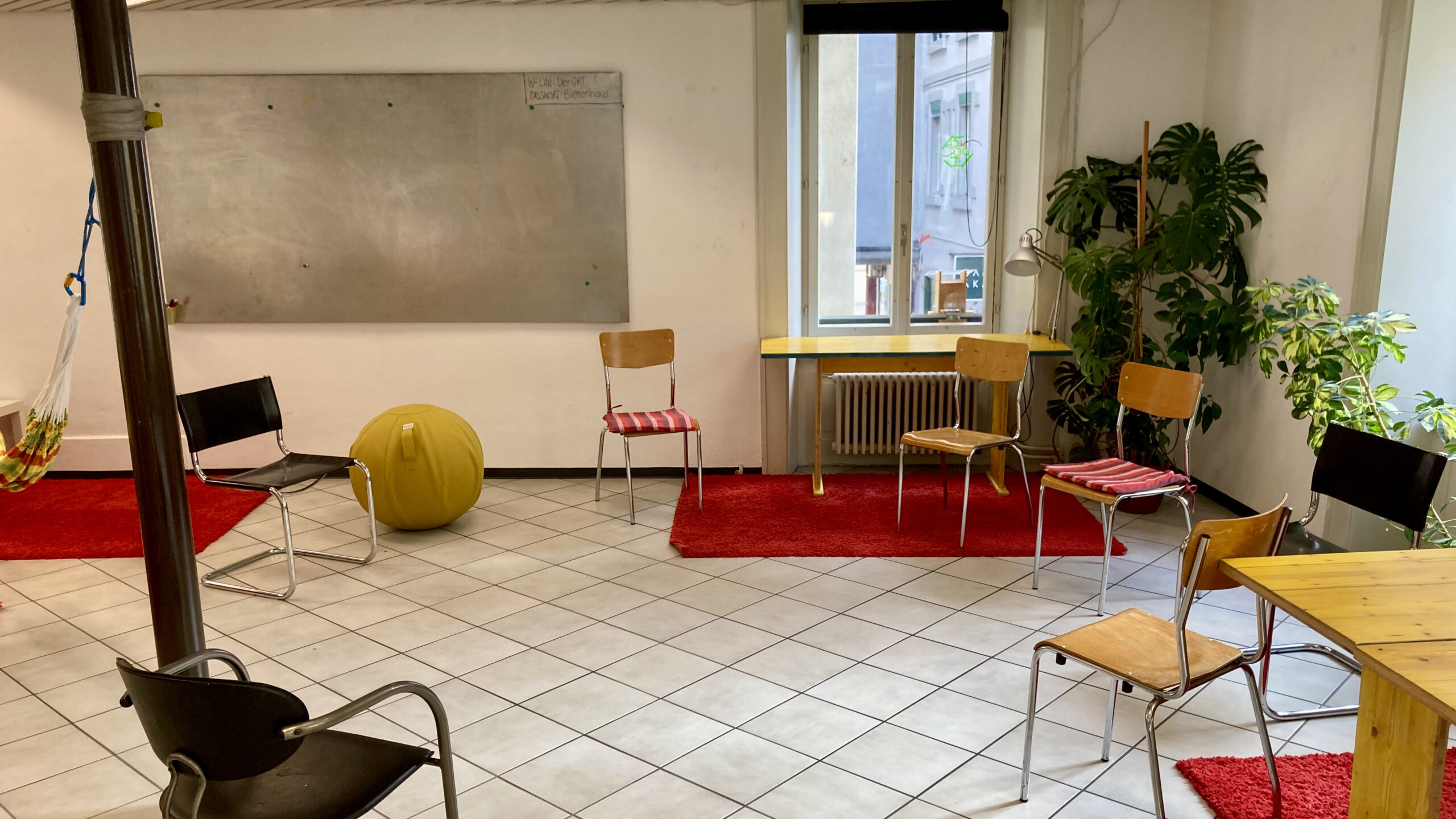 Der gemütliche Kursraum im 1. Stock, wahlweise mit Stuhlkreis oder Tischen, kann für Gruppen bis 20 Personen genutzt werden. Zwei Stellwände sorgen für Sichtschutz. Was dir hier auch noch zur Verfügung steht: